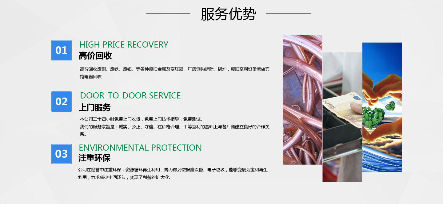 呼应绿色生活、资源循环利用的理念,以保护环境为己任,走可持续发展之道路,坚持把变废为宝作为奋斗目标的经营理念。凭借丰富的收购、销售经验;雄厚的资金,完善的销售模式和可靠的售后服务一直深受新老客户的信赖。